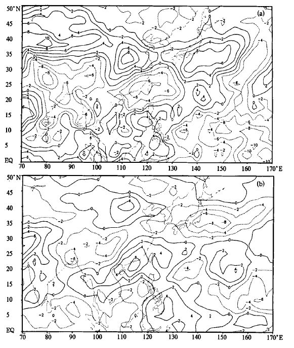 | 图 2. 7~9月OLR距平场合成分布 (a) 涝年,(b) 旱年 (单位:W·m -2) | |