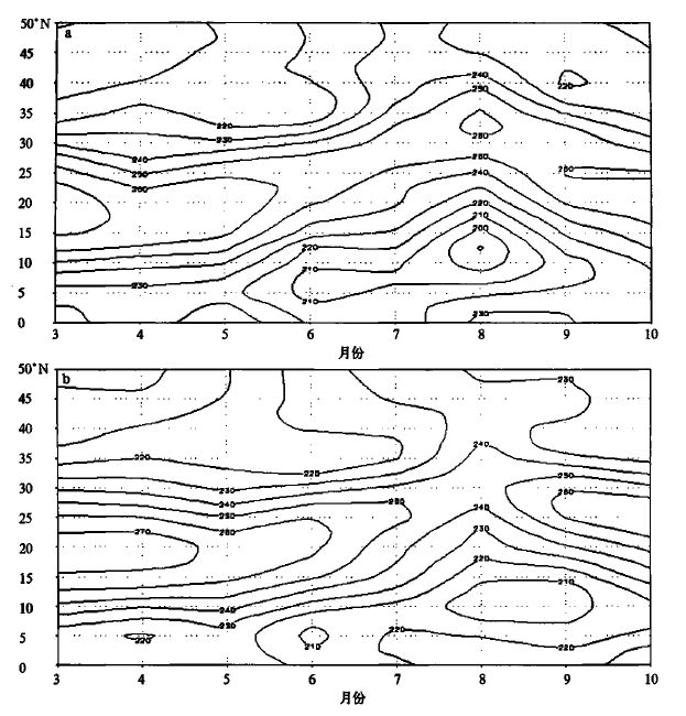 | 图 3. OLR沿140°~150°E范围时间-纬度剖面 (a) 涝年,(b) 旱年 (单位:W·m -2) | |