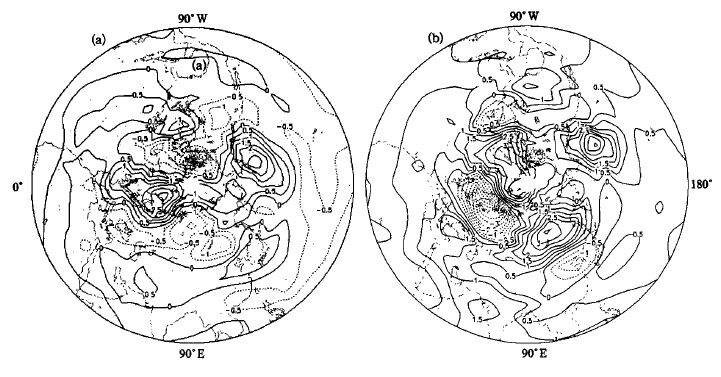 | 图 4. 7~9月500 hPa高度距平场分布 (a) 涝年,(b) 旱年 (单位:10gpm) | |