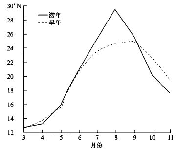 为了进一步明确旱涝年西太平洋副高位置随季节北进南退的差异,图 5给出旱涝年副高脊线位置的季节变程。图上可见,无论是涝年还是旱年由春入夏西太平洋副高都有一次北跃过程,但涝年北跃明显大于旱年。