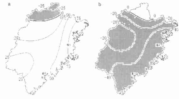 | 图 6. 8月副高脊线偏北年 (a)、偏南年 (b) 降水距平百分率合成 (阴影区为负值) | |
