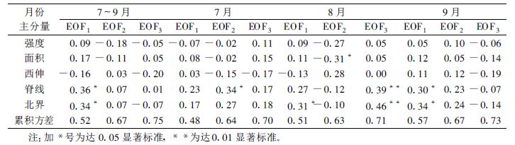 表 1 副高特征量与夏季降水EOF主分量相关系数及EOF特征量累积方差 |