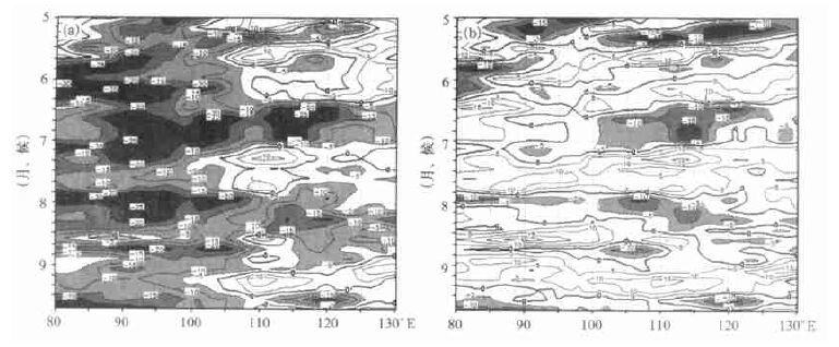 | 图 1. 2001年5~9月5°~20°N、80°~140°E TBB候平均 (a) 和候距平 (b) 经度-时间剖面图 | |