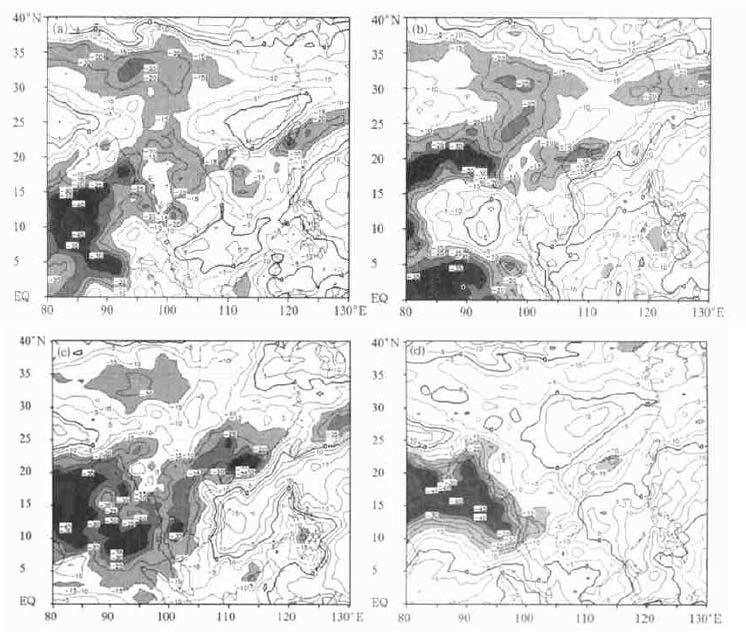经过短暂的间歇后,5月末孟加拉湾季风再次加强,紧接着6月初印度季风爆发。印度季风爆发后,迅速向东传,孟加拉湾季风随之加强,并影响到中南半岛。图 2给出了2001年5月第6候至6月第3候各候TBB候平均图,从图 2a中可以看到:在孟加拉湾西南部,有对流云团正在发展,云团中心区域的TBB值达-45℃,比历史同期偏低约40℃(图略),表明5月末孟加拉湾季风再次爆发,而且比第一次更强。到6月第1候 (图 2b),季风云团中心已移到孟加拉湾东部、靠近缅甸西部海岸,中心强度仍为-45℃,季风云系区的北界抵达25°N一带。与此同时,另一个中心强度为-45℃的强对流云区出现在印度半岛南部,它比历史同期多年的候平均值低35℃(图略),这表明此次印度季风开始爆发阶段的强度明显强于多年平均状况。6月第2候 (图 2c) 已爆发的印度季风云系分成两支向孟加拉湾扩展,一支沿印度东海岸向孟加拉湾北部传播; 另外一支向孟加拉湾南部,并经过安达曼-尼科巴群岛向中南半岛传播。在这一候里中南半岛的季风云系也得到加强,而且影响到了我国西南地区的东南部和华南地区。6月第3候 (图 2d) 印度季风云系仍然保持很强的势头,其中心区TBB候平均值由原来的-45℃降到-50℃,比历史同期偏低25℃(图略),而且直接向东传播,穿过孟加拉湾,一直扩展到中南半岛。