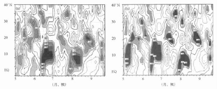 | 图 3. 2001年5~9月110°~122°E、0°~40°N TBB候平均 (a) 和候距平 (b) 纬度-时间剖面图 | |