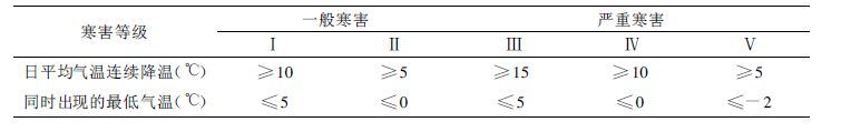 寒潮是天气学概念,根据《广东省各类主要灾害性天气标准》规定,单站寒潮指标为:日平均气温在24h内下降8℃或以上 (或48h内下降10℃或以上),同时过程最低气温≤5℃; 寒潮出现后天气回暖到日平均气温≥12℃,同时极端最低气温>5℃,寒潮结束。从其定义不难看出,该寒潮指标强调的是剧烈降温型天气过程,而对于由几股冷空气持续补充,导致气温持续下降,进而出现严重的农作物受害时,该指标往往没有反应。典型的例子是1999年12月中下旬连绵至2000年1月上旬的持续降温天气过程,低温天气持续时间长,极端气温低,给全省农牧业造成直接经济损失百亿元,但根据上述指标达不到寒潮标准。可见作为目前业务标准并在科研中得到广泛应用的寒潮指标,若直接借用于寒害指标在反映农作物的实际受害表现方面具有明显局限性。