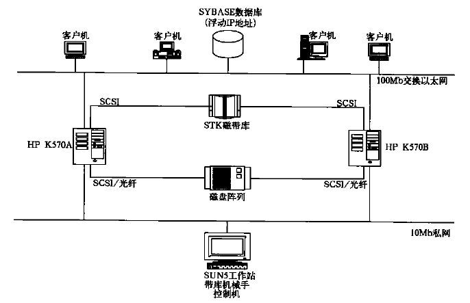 国家卫星气象中心现有存储系统由HPK570服务器、磁盘阵列、STK9360自动磁带库、VERI TAS存储管理软件、SYBASE数据库和存储编目检索应用软件构成,存储系统服务器、数据库、带库联接示意图见图 1。其中两台HPK570服务器作为S TK磁带库与S YBASE数据库的主控服务器互为备份,采用HP高可用软件,当一台服务器或某一类应用软件故障时,整机业务或故障业务自动切换到另一台服务器。STK磁带库与S YBASE数据库分别采用浮动主机名与浮动IP地址,使服务器整机业务或某应用的切换对磁带库与数据库的使用而言完全透明。