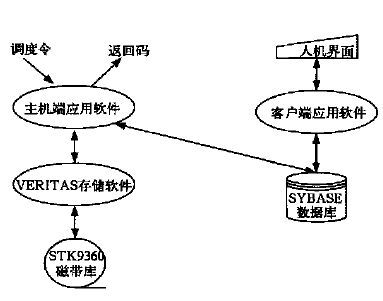 | 图 3. 应用软件、SYBASE数据库、VERITAS存储软件以及STK磁带库逻辑关联示意图 | |