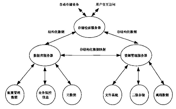 存储编目检索软件的层次框架结构是基于由存储检索服务器、数据库服务器和资源管理服务器以及一个或多个客户程序构成三层的三角形架构的客户/服务器模型,如图 4所示。自动存储业务和用户的交互访问通过存储检索服务器进行。由于气象卫星数据量的巨大,数据分为结构化数据和非结构化数据两个层面进行编目管理。访问非结构化数据时通过结构化数据进行逻辑化物理映射、监控和管理。