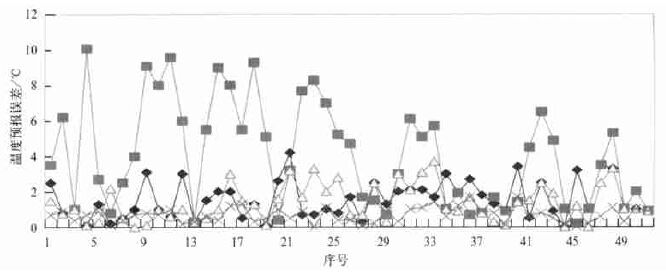 | 图 1. 2001年7月4日最高温度预报误差对比分析(54区共51站) (◆—MOS,■—DMO,△—神经元,× 综合集成) | |
