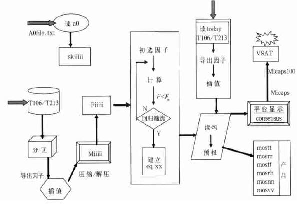 3 预报产品及结果检验建立方程过程中,随机选取其中五分之一的样本不参加回归计算,而是作为预报试算而获得预报误差,并以此来衡量所建预报方程质量的好坏。如试算结果的误差太大,首先需要检查所用资料是否有错,然后调整因子及因子个数,以改善方程质量。方程建立后还需不断验证、改进,使预报质量稳定。日常预报时,只需将数值预报资料按原定的诊断程序计算、并插值到各个站点,代入建好的方程中,获得全国2000多个站的要素预报值。最后,据预报服务的要求,以MICAPS图或文件形式生成产品,传递到服务器上,供预报员使用。图 3 为整个MOS预报系统的业务流程。