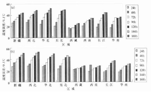 | 图 4. 全国8个区2003年1月份24~120 h温度最高(a)和最低(b)预报误差 (每组图依图例自上而下次序排列; 以下同) | |