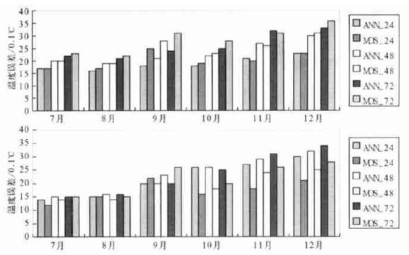 图 5 为2002年7~12月两种方法对最高、最低温度预报月平均绝对误差的比较,图中显示最高温度预报24 h、48 h除9月份以外,两者相近。而9月份MOS在3个时次都报得较差,72 h MOS也比人工神经元网络预报的误差略大。对最低温度预报除9月份MOS预报误差较大外,10~12月份神经元网络预报比MOS报的明显差,主要是前者存在着较大的系统误差(约1℃左右),这是今后对神经元网络方法需要解决的问题。
