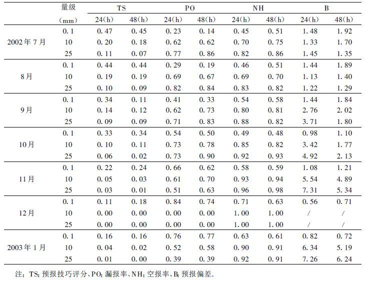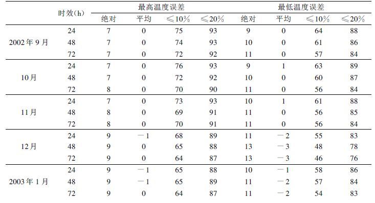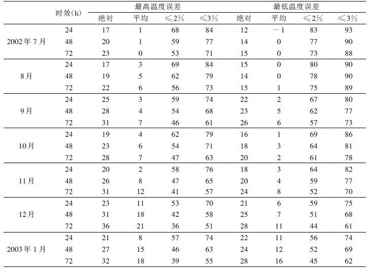 鉴于全国2000多个站点的日最大风速、云量和能见度等要素日常收集资料有困难或者可靠性较差,故在此仅列出2002年7月~2003年1月的温度、降水量和相对湿度(2002年9月开始)预报检验结果(表 1~3) 。由表可见: ① 最高温度预报平均绝对误差24~72 h分别在1.7~2.5℃、1.9~3.1℃、2.3~3.6℃; 最低温度预报平均绝对误差2~72 h分别在1.2~2.2℃、1.4~2.5℃、1.5~2.8℃; 从夏到冬温度变异逐渐增大,其预报误差也随之加大。因此,冬季比夏季误差大,最高温度比最低温度误差大; ② 绝对误差小于2℃的站数占总站数的百分比,24 h预报最低温度在56%以上、最高温度达53%以上; 48 h分别为51%和42%以上。如果以大于或等于50%的站预报误差小于或等于℃为可用预报标准,那么以这7个月平均情况而言,最高温度预报误差小于或等于2℃的平均百分率24~72 h分别是61%、52%和45%,最低温度分别是68%、63%和58%。由此可见,最低温度可用预报达72 h ; 最高温度达到48 h ; ③ 当天气形势变化较平稳时,预报误差较小,一般可不订正,当形势转变或天气状况变化较大时须对影响区进行温度订正; ④ 最高相对湿度预报24~72 h绝对误差小于或等于10%的站数占总站数的百分率为64%以上,绝对误差小于或等于20%的占87%以上; 最低相对湿度预报24~72 h绝对误差在13%以内,绝对误差小于或等于10%的站数占总站数的百分率在46%以上; 可以认为,在大多数情况下,72 h以内的相对湿度预报已达到可用预报水平。⑤ 24 h 0.1 m以上降水预报TS评分24 h在0.47~0.11,随雨季转旱季而逐渐降低; 漏报日和空报日分别为0.23~0.84、0.45~0.71,可见漏报日和空报日随雨季转旱季而增大明显,冬季降水预报参考性明显下降。中雨以上的降水预报TS评分迅速下降,达0.20以下,25 m以上降水达0.09以下。因此,中雨以上的降水量不可参考。48 h降水预报比24 h稍差,但差别不算特别明显。