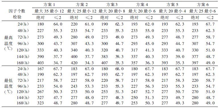 在回归运算过程中,发现方程质量好坏与所选取因子个数有关,并非因子个数越多越好。为此,选择不同的最大和最小因子个数如表 4 所列的6个方案进行并行试验。由2002年9~11月预报结果(略)比较得出: ① 各站(时效)建不出方程的个数: 方案1~6分别为5、8、3、1、3和3个; ② 各试验预报结果表明,24~48 h 9月方案1误差最小; 方案次之,其它相差不大。10~11月24~48 h方案4误差最小或与方案1接近; 120 h以上方案4误差明显小于其他,而方案1随预报时效增大而明显变大; 误差小于2℃的百分数(占总站数)9月份24~48 h方案1比方案4略高,但96 h以上方案4较其它方案高; 对于10~11月,方案4各时效均较其它高,特别是96 h以上; ③ 3个月试验的平均情况与逐月类似,由表 4 可见: 最高、最低温度24~48 h第1方案绝对误差比较小,而其它方案比较接近; 72 h方案4与第1方案相近,且均较其它方案误差小; 96 h以上方案4明显优于其它方案,而方案1的误差增长的非常快。④ 尽管因子数多,24~48 h预报误差有时比较小,但并不是因子数越多越好,有时因不确定因素多,预报误差反而增大,特别当预报时效增大时; ⑤ 最小因子数如确定的太大,达不到F检验的要求,有时建不出合适的方程; 最小因子数少,容易达到建方程的要求,但因子数太少,又会使预报精度降低。