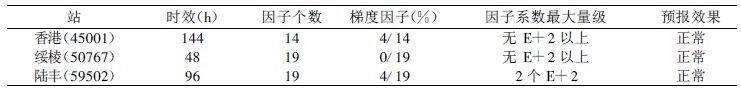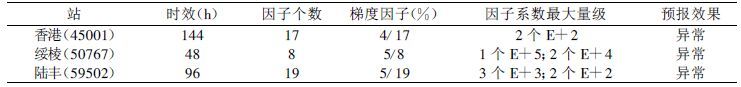 方程建好后并非万事大吉,在具体预报时,发现个别站、个别时效会出现异常预报值。为了寻求其原因,这里剖析表 5 中3个站为例,发现预报出现异常,主要是选取的预报因子中含有梯度(如温度梯度、高度梯度、风的梯度)成分,并且,这些梯度因子的方程系数量级比较大,这就加大了预报的不确定性,容易造成预报值计算的异常。经过改变参数,重建方程,因子及其系数如表 6 所列,预报值就正常了。