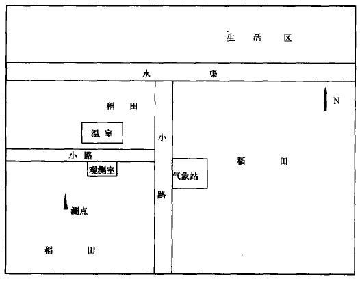 常熟农业生态站位于常熟市南郊主要稻作区, 除东边有一条市际公路以外, 三面均被相同品种和土质的大片稻田所围绕。生态站共有土地200多亩, 一条灌渠把该站分为南北两部分, 南半部即为试验田。试验田东西长204 m, 南北宽113 m。测点距东围墙162 m, 西围墙42.5 m, 南围墙33.3 m。围墙总高度2.5 m, 2 m以下为实体墙, 上部0.5 m呈锯齿形。观测点NNE方向40多米有一塑料大棚种植无土栽培西红柿、青椒等蔬菜。大棚面积约为40 m ×25 m, 高约5~6 m。测点以东100 m左右为标准气象观测场, 内置一套自动气象站。试验田内基本都种植一季中稻 (见图1)。在通量观测的同时还同步进行了气象观测, 包括风向、风速、气温、相对湿度、地温和气压等。
