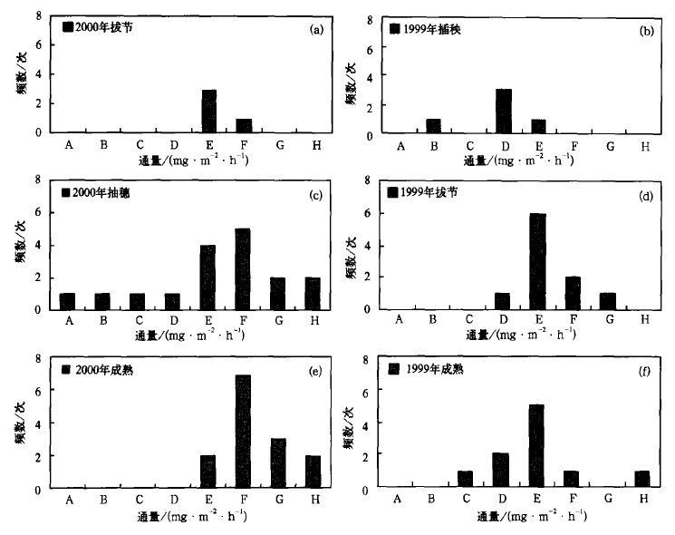 2 结果与讨论 2.1 N2O垂直通量概况图5分别列出了1999年和2000年稻田低层大气N2O垂直通量出现频数分布图。结果表明:水稻各个生长期所观测到的N2O垂直通量不尽相同, 但是各个生长期N2O垂直通量还是有一个相对集中值, 即有一个最多频数出现值。1999年的拔节期、成熟期和2000年拔节期N2O垂直通量最多频数出现在0~1.0 mg·m-2·h-1, 2000年抽穗期和成熟期最多频数出现于1.1~2.0 mg·m-2·h-1, 而1999年插秧期N2O垂直通量最多频数出现在0~-1.0 mg·m-2·h-1。这似乎表示插秧期N2O垂直通量方向由大气指向地面。而随着水稻的逐渐生长N2O垂直通量方向逐渐由地面指向大气, 而且其通量值也逐渐增大。由于限于资料的局限性, 更详细的分析讨论, 还有待进一步的实验结果。