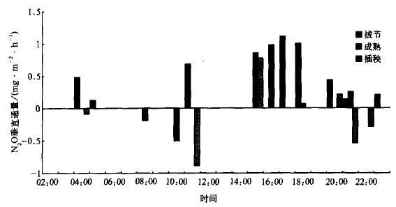 把1999年插秧、拔节和成熟期的观测资料求出小时平均 (图6), 从图6可以看出尽管各生长季N2O小时平均垂直通量的日变化不完全相同, 但是有一点是共同的, 即其最大值大致出现在15:00~17:00。