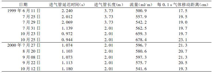 1.4 试验条件(1) 条件采样装置的气流参数气流在条件采样装置中的运动状态是十分重要的, 表1列出了不同观测时段从空气样进气口到分离器主泵的长度, 以及相应延迟时间, 管路中气体流速和每0.1 s气体在管路中移动距离。从表中可以看出整个试验期间管道中气体流速大约在500~600 ml/m, 样品气在管道中每0.1 s移动距离约20 cm。也就是说每个气样在管道中占有约20 cm的长度, 这对于保持样品气能够少受相反垂直方向气柱的影响还是十分重要的。观测中实际并非每0.1 s垂直风速方向就有变化、有时同一方向可以连续几个0.1 s还未变化, 也就是说在进气管路中将有相同方向几倍的20 cm长度样品气柱, 这将可以减少管路中垂直方向不同样品气的相互影响。