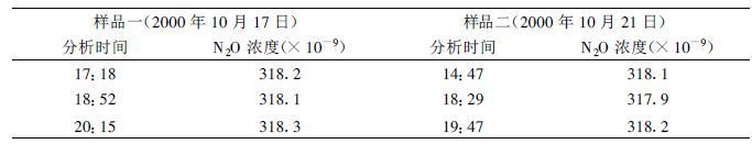 (3) 样品存放时间分别在2000年10月17日和21日做了样品存放试验。将样品袋充满N2O标气, 10月17日初始浓度为318.2 ×10-9, 将近2 h后测得其浓度为318.1 ×10-9, 约3 h后其浓度为318.3 ×10-9。10月21日试验结果也十分相近, 而且延迟到近5 h后测定变化也仅0.1 ×10-9。在试验期间从采样到进行样品分析间隔时间一般都不会超过2 h, 因此存放时间带来的误差是可以忽略的 (表2)。