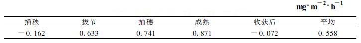 将1999年观测资料与2000年补充观测资料合并统计, 插秧期和收获后N2O垂直通量较小而且出现负通量, 其值分别为-0.162 mg·m-2·h-1和-0.072 mg·m-2·h-1, 拔节期、抽穗期和成熟期平均N2O垂直通量分别为0.633 mg·m-2·h-1、0.741 mg·m-2·h-1和0.871 mg·m-2·h-1(表3)。