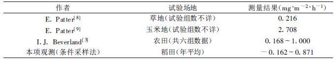 2.5 与国内外观测结果比较由于没有国外有关使用条件采样法在稻田测定N2O的观测数据可以对比, 表4仅列出了国外草地、农田 (文献未标出何种种类农田) 和玉米田N2O垂直通量数据。从表中可以看出本次N2O垂直通量观测结果 (年平均值) 大于国外草地, 接近农田观测结果, 但比玉米地小。在本项观测试验中附带进行的少部分箱式法资料表明, 箱式法观测结果与国内王明星、郑循华和陈冠雄等人的观测结果比较接近[10~12、18]。如果把表4和表5对照起来看就可以发现这两种观测结果有一定差异。使用条件采样法所得出的观测结果大于用箱式法结果。箱式法和条件采样法反映了两种不同的物理概念, 前者反映了土壤与农作物排放通量, 而后者则反映了低层大气的垂直输送通量。
