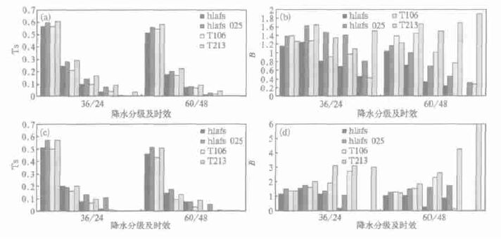 3 对比试验结果分析在上述方案的基础上,我们建立了实时资料预报对比试验系统,并对2001年10月以来的降水预报结果进行了降水统计检验。图 1中给出了2002年夏季 (6到8月) 全国范围各业务预报模式24h和48h预报的Ts评分和预报偏差 (B) 的平均值 (由于降水观测资料的原因,业务检验中,中期预报模式的预报时效延后12 h)。图 1(a)、(b)分别给出了全国范围降水预报检验结果对比情况,从图 1 (a)中可以看出,不管是24h预报还是48 h预报,改进方案 (HLAFS 025) 的降水预报都优于业务系统的预报 (HLAFS),改进效果较为明显。至于不同预报模式间预报的比较,改进方案 (HLAFS025) 的预报也优于T106的降水预报; 而与T213模式的预报比较,就Ts评分而言,在各个级别的预报中改进方案预报的Ts评分值都稍低于T213的预报,但从预报偏差值 (图 1(b)) 可以看出T213的预报在48h后出现较多的空报 (B值大于1)。总体而言,改进方案的降水预报优于T106和原有限区域业务预报模式,略逊于T213预报模式,但就不同季节、不同年份、不同天气形势下的预报则与T213模式的预报具有较好的互补性。图 1(c)和图 1(d)分别给出了与图 1(a)、图 1(b)同时刻的我国东北地区各业务预报模式24h和48h预报的Ts评分和预报偏差 (B) 的平均值,从图中可以看出,在这一地区,大多数情况下改进方案的预报都略优于T213模式的预报,且预报偏差也更接近于1。类似的情况也出现在西北地区东部、长江中下游地区等。