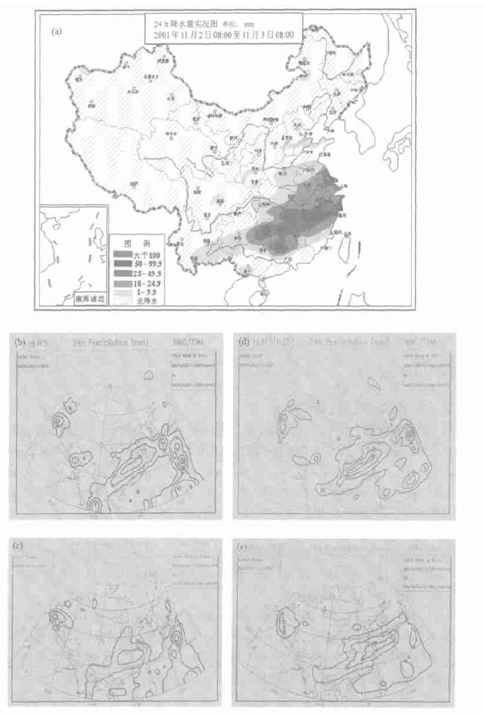 | 图 2. 降水预报对比 (a)2001年11月2日08:00到3日08:00降水观测实况,(b)(c) 分别为对应时刻业务预报模式的24h和48h降水预报结果,(d)(e) 分别为对应时刻试验预报方案的24h和48h降水预报结果 | |