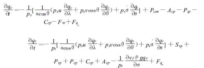上述方程中的普通变量与原模式中的说明相同,与显式降水方案中微物理过程有关的部分说明如下:Pcon,大尺度水汽凝结项,其中包括水汽的凝结和云水的蒸发; Svp雨水蒸发项,在暖区 (0℃以上) 包括雨水的蒸发和过饱和水汽的凝结,在冷区 (0℃以下) 包括过冷水的凝结,冰雪的升华和凝华; Pvp冰晶的核化; Pcp冰晶的繁生; Ccp雨滴 (或冰雪) 在下降过程中与云水及过冷水的碰并; Acp云水向雨水的自动转换项; Fre温度低于0℃时云水的冻结项; Mpr,Fp分别为雨水的融化和冻结; vf为雨水 (或冰雪) 的总体下落速度。