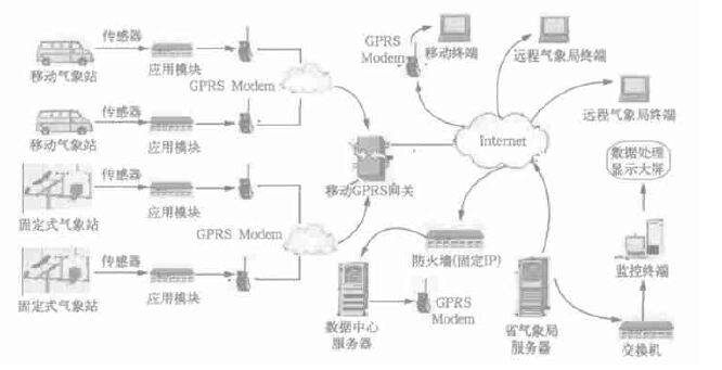 数据中心数据处理接收处理设备一般应包括固定公网IP地址的宽带接入,配置高性能数据服务器支持大数据量的存储设备,以满足众多远程应用端的访问。配置专用数据通信服务器,有效管理数据的接收和远程应用端的访问。配置用于中心对远程气象观测站呼叫的GPRS Modem, 发送控制指令。同时应配置适当的防火墙,保证数据的安全性。