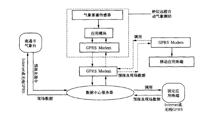 中国移动通信公司 (以下简称中国移动) 新近推出的GPRS (General Packet Radio Service) 移动网络为解决上述问题提供了条件[2~4]。我们依托GPRS网络,在利用现有稳定网络技术,实现以小数据流方式,实时、无线传输多点气象观测数据及双向传输监控信息方面做了尝试,试图实现野外自动气象站观测数据的实时采集和对观测设备运行状态实施监控; 根据需要远程控制观测密度,解决野外自动气象观测数据的传输及双向管理。并运用于“苏通长江公路大桥施工期气象环境实时监测及预报预警服务系统”的建设及应用服务中,达到促进气象现代化建设的目的。