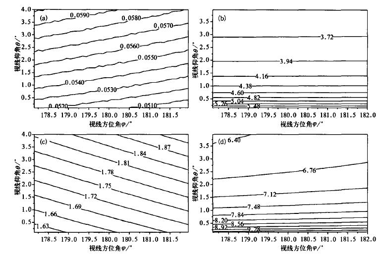 图2给出了利用SBDART计算得到的 |rgh| 和 |rgv| 分布的两个典型结果。这里需要指出的是:SBDART是被设计用于计算平面平行大气辐射传输问题的,其计算结果可能会与实际地球大气的情况有差异,但在SBDART中已经进行了一级修正,考虑了球形几何对直射光束衰减的影响,可以较好地给出太阳入射到低层大气的光强分布,因此上述计算结果可用来较好地估计天空亮度分布的不均匀性。显然,要想保证rdl与1的差异足够小,最好选择视线仰角相同的目标和背景,并采用合适大小的目标物使得不同目标物视线方位角的差异尽量小。