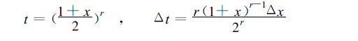 7 Gauss 数值积分的改进为了较快地计算通道平均透过率,1981 年石广玉[9] 提出,将Gauss 数值积分法用于k分布法,取N 为截点数,为了把0 和1 作为积分上下限,石广玉采取式(5)的变换后,t 的上下限为0 和1 。Δt 代表各分段的权重,其和为1 。