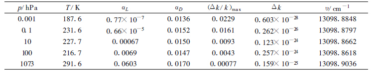 表 1 中,Δk 与v(cm-1)分别是(Δk/k)max 处一个步长的吸收系数变化及波数。由表 1 可看出:气压很低处如0.001 hPa, αL 小,吸收系数k 的最大相对变化(Δk/k)max=0.0229,小于2.5 %,当气压p ≥10 hPa 时,(Δk /k)max <1 %。当步长Δv变小,(Δk/k)max大致按比例减小。可以认为:把通道范围1.4141 cm-1等分为30000 段,即取步长Δv≈4.7×10-5 cm-1可以保证足够的精度。