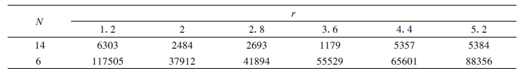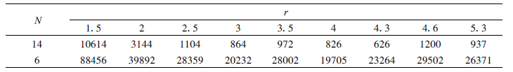 不同的r 和N 时的均方差见表 5 。由表 5 知,选用N=14,r=4.3,均方差为6.26×10-6,误差数值较小。对含有S >10-26 (cm/mol)强线的通道,用式(8)变换,以12990 cm-1通道为例,表 6 取N=6 和N=14 均方差都较大。