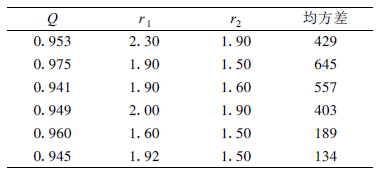 表 7 12990 cm-1通道N=20 时不同分界点Q 及变换指数r1 与r2 的均方差(×10-8) |