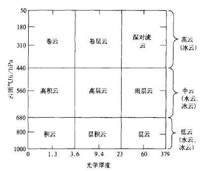 1 资料简介和区域划分本文采用ISCCP D2 1983 年7 月~ 2001 年9 月的2.5°×2.5°分辨率的月平均云气候资料.ISCCP(国际卫星云气候计划)是世界气候研究计划(WCRP)主要项目之一,它通过收集、分析卫星辐射测量值以推断云的时空分布特征及其变化,从而促进科学界对云在辐射平衡过程和全球水循环过程中的作用的研究.该资料是由4 颗地球同步卫星(GMS ,METEOSAT ,GOES ,INSAT)和至少一颗太阳同步极轨卫星(NOAA)获取的辐射测量值,经过云识别、辐射分析、统计分析处理后得到云的时空分布.中国西部地区的资料主要由GMS ,INSAT 静止卫星和NOAA 极轨卫星提供.较此前的C2 数据集、D2 数据集有较大改进,在辐射定标、阈值确定方面运用了新的方法,给出了更详细、更准确的结果.最明显的变化是D2 数据集除了给出15 种不同类型的云的云量以外(单位为云所占天空的百分比),还给出了其平均物理性质,如云顶气温、云顶气压、光学厚度、云水路径等.D2 资料中的云是按照云顶气压和光学厚度进行分类的(见图 1),云顶气压大于680 hPa 的定义为低云,680-440 hPa 的定义为中云,小于440 hPa 的定义为高云.然后根据光学厚度的不同将云分为9 种具体云类,再根据云顶温度把中云和低云中的各种具体云类分为冰云和水云,如果云顶温度低于260 K ,就被认为是冰云,而高于260 K ,就被认为是水云,高云则被认为全部是冰云,这样一来,就把云分成了15 种具体类型.Rossow 等[11] 的对比研究结论是ISCCP 资料的云量与其他资料吻合得比较好,全球偏差在4 %左右.魏丽、王可丽、翁笃鸣等[4~7] 也证明了ISCCP 资料在中国地区的可用性.1999 年Rossow 等[3] 公布了对D2 资料准确性进行的研究,结论是通常云量的误差≤5 %,光学厚度的误差≤10 %。