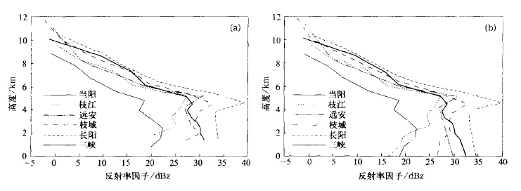 图 1a 是宜昌雷达实际观测VPR 的1 小时平均VPR ,时间是2002 年6 月24 日10 :00~ 11 :00(北京时,下同)。作为对照,图 1b 是增加了零海拔高度的拟合反射率因子值时的1 小时平均VPR 。与表 1 的实测小时雨量相对照可以看到,雷达估测值整体偏小,拟合法估测值在中到大雨的区域相对更合理,长阳、三峡还得到了较明显的改善。