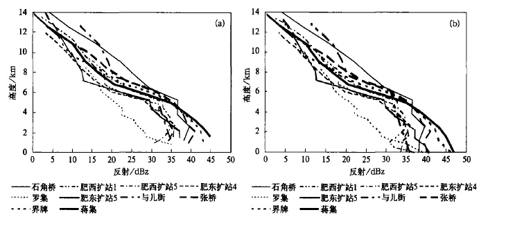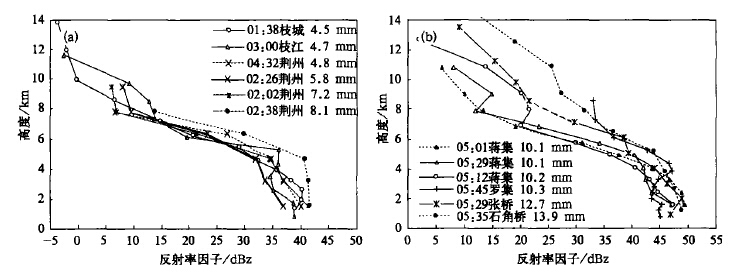 4 超短时强降水的VPR图 3a 和图 3b 分别是宜昌和合肥雷达周边10 min 雨量超过4.5 mm 和10.0 mm 所对应区域上空的实时VPR ,体扫开始时间、地点与雨量都在图 3 的图例中标明。分析这样的廓线可以看到,这些廓线都看不到亮带的特征,几乎都是随高度下降反射率因子值越大,4 km 以下回波都很强,说明强降水中心一直从地面蔓延到几公里高度的范围内,最低仰角测得的反射率因子值在图 3a 中是37-42 dBz ,图 3b 中是45-50 dBz ,反射率因子值与地面降水量总体对应得很好。比较图 3a 和图 3b 中的廓线可见图 3b 中的回波整体要高于图 3a 中的,说明图 3b 对应时段、区域的云体发展更深厚、对流更旺盛。