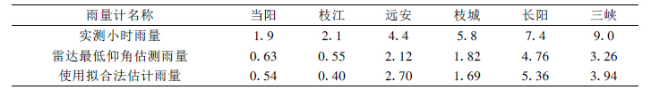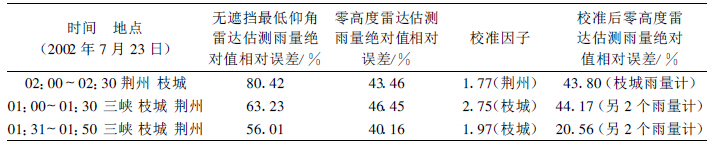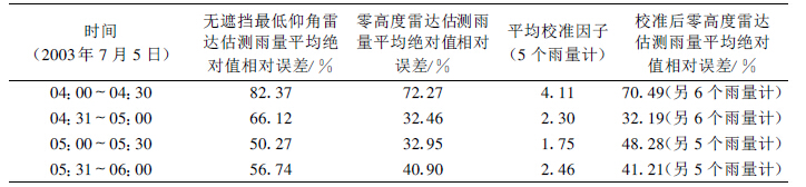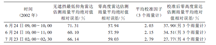 经计算得到了平均校准法订正系数,结果见表 3~表 5 。无遮挡最低仰角雷达估测雨量及拟合法雷达估测零高度雨量的相对误差、平均订正因子及用此订正系数计算出的雨量相对误差都在表中列出。在所选个例的时段内用拟合法估测零高度雨量的相对误差都比最低仰角雷达估测雨量的相对误差要小。