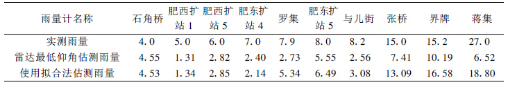 由于缺乏地形数据,本文计算的是零海拔高度的可能反射率因子值,以此来代替地面估计值。距离地面过高的空中反射率因子值与地面降水相关性较差,甚至是负相关,距离地面过低又易受地面各种因素的影响以及云基高度的影响,因此取中低层仰角的数据比较合适。在拟合计算中,取最低4 个仰角的反射率因子垂直廓线值,如有遮挡就去掉再往上取值,如遇到亮带也去掉且不再取值。合肥周边雨量计较多,且很多距离雷达近,易受地物影响,计算时先去掉了800 m 以下的数据。之后比较估测的2 次和3 次曲线拟合值,取最接近计算中最低高度的强度数值作为地面估计反射率因子值。