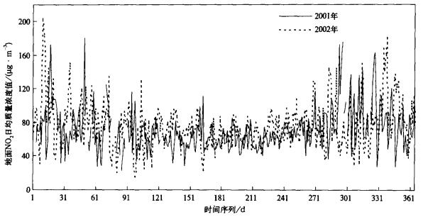 根据北京市2001年1月1日—2002年12月31日NO2污染指数数据计算这段时段地面NO2日均质量浓度值, 作时间序列图。北京市2001年、2002年地面NO2日均质量浓度日变化如图 1所示。