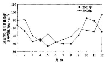 | 图 2. 北京市2001年、2002年地面NO2日均质量浓度月平均变化图 | |