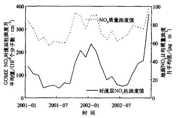 | 图 3. 2001年1月—2002年12月北京上空GOME NO2对流层柱浓度月平均变化与北京市地面NO2日均质量浓度月平均变化的比较图 | |