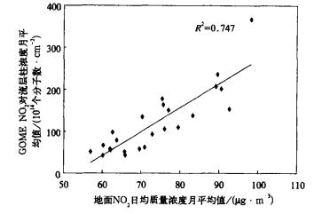 | 图 4. 2001年1月—2002年12月北京上空GOME NO2对流层柱浓度月平均值与北京市地面NO2日均质量浓度月平均值相关分析图 | |
