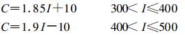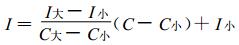 式 (1) 中, C大与C小是在API分级限值表 (表 1) 中最接近C值的两个值, C大为大于C的限值, C小为小于C的限值; I大与I小是在API分级限值表 (表 1) 中最接近I值的两个值, I大为大于I的值, I小为小于I的值。