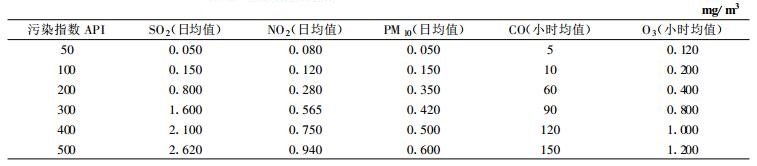表 1 我国城市空气污染指数对应的污染物浓度限值 |
