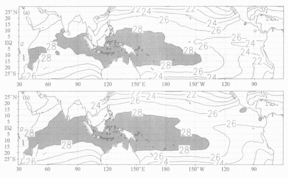 图 5. 夏季热带太平洋、印度洋海表温度的平均分布状态 (单位:℃, 图中阴影区为大于28 ℃区域) (a) 1951—1976年, (b) 1977—2000年 |