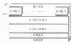 软件的分层设计是开放系统应用程序可移植性的基本要求。分层式的软件结构有利于将应用级程序与低层的系统软件和操作系统层分离。依据各层向邻层所提供的服务功能不同, 开放系统模型分为物理层、网络层、操作系统层、应用层等, 各层间通过一系列的标准调用实现层与层之间的功能服务。如图 1所示[3], 图中网络服务层包括网络数据接入、因特网、TCP/IP协议等服务联结, 在网络层与应用层之间是软件系统的内部结构层。应用程序设计库是应用模块的接口函数, 应用程序使用一系列的标准调用接入低层的系统服务。在应用程序与操作系统间及与应用程序设计库之间是确定的应用程序接口函数 (API) 规程 (图中以加重的阴影标识)。分布式应用服务层是负责网络节点数据广播-接收, 请求-服务, 事件监听-调度的管理工具和函数库。